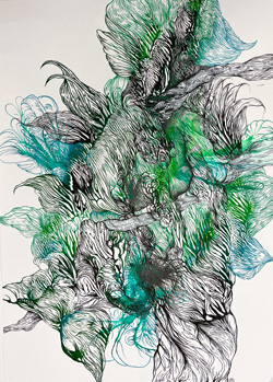 Le projet “Black Forest” met en avant la volonté de ne plus recourir à des artifices, se positionnant véritablement au cœur de la nature. La profusion de couleurs est mise de côté pour mettre l’accent sur le dessin et la matière. Les formes noires s’entrelacent et se tortillent comme de véritables organismes naturels, progressant sur le papier ou la toile dans une prolifération rappelant une nature fleurissante.